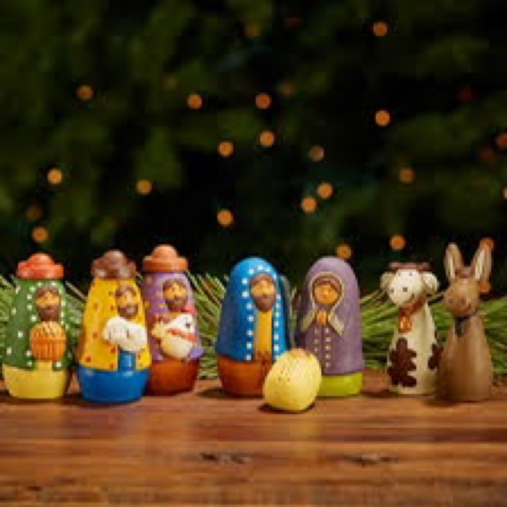 This bright and colorful nativity set brings colorful fun and artistry together. Each terracotta figure is molded and painted by hand in bright colors, and is sure to bring a smile to anyone who sees it. 8 piece nativity set consisting of the Holy Family, the 3 Magi, and 2 barnyard companions. Dimensions: 8 pcs, Tallest figure: 3 3/4"h.