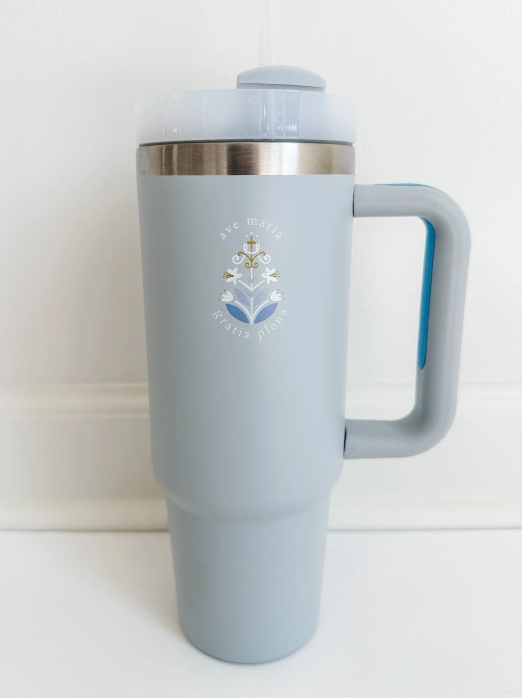 Imbued with symbolism, each tumbler features a one-of-a-kind design showcasing the lily flower, a timeless symbol of the Virgin Mary's purity and grace. Paired with the Marian monogram and encircled by the Latin phrase, "Ave Maria Gratia Plena" (Hail Mary Full of Grace), this tumbler is a beautiful vessel of both refreshment and reverence.