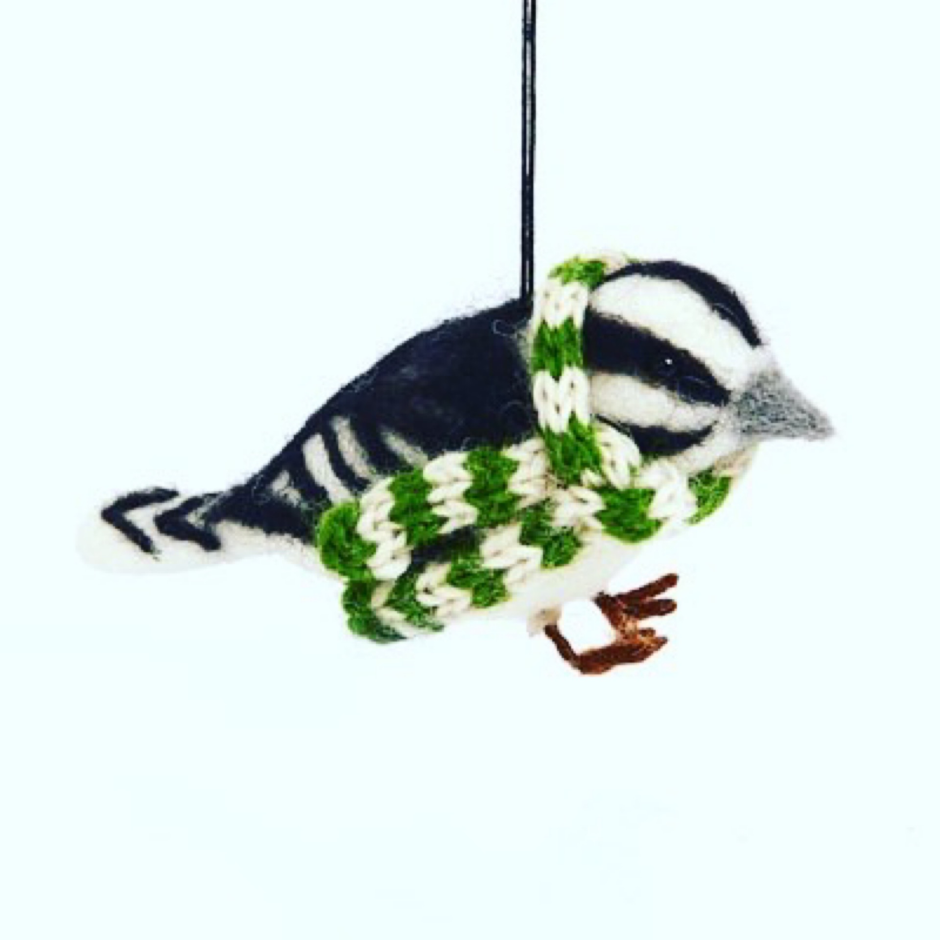Needle-felted wool animal ornaments feel right at home on your holiday tree. This cozy woodpecker comes dressed for winter in a colorful hand-knit scarf. Adorable! 3"h.