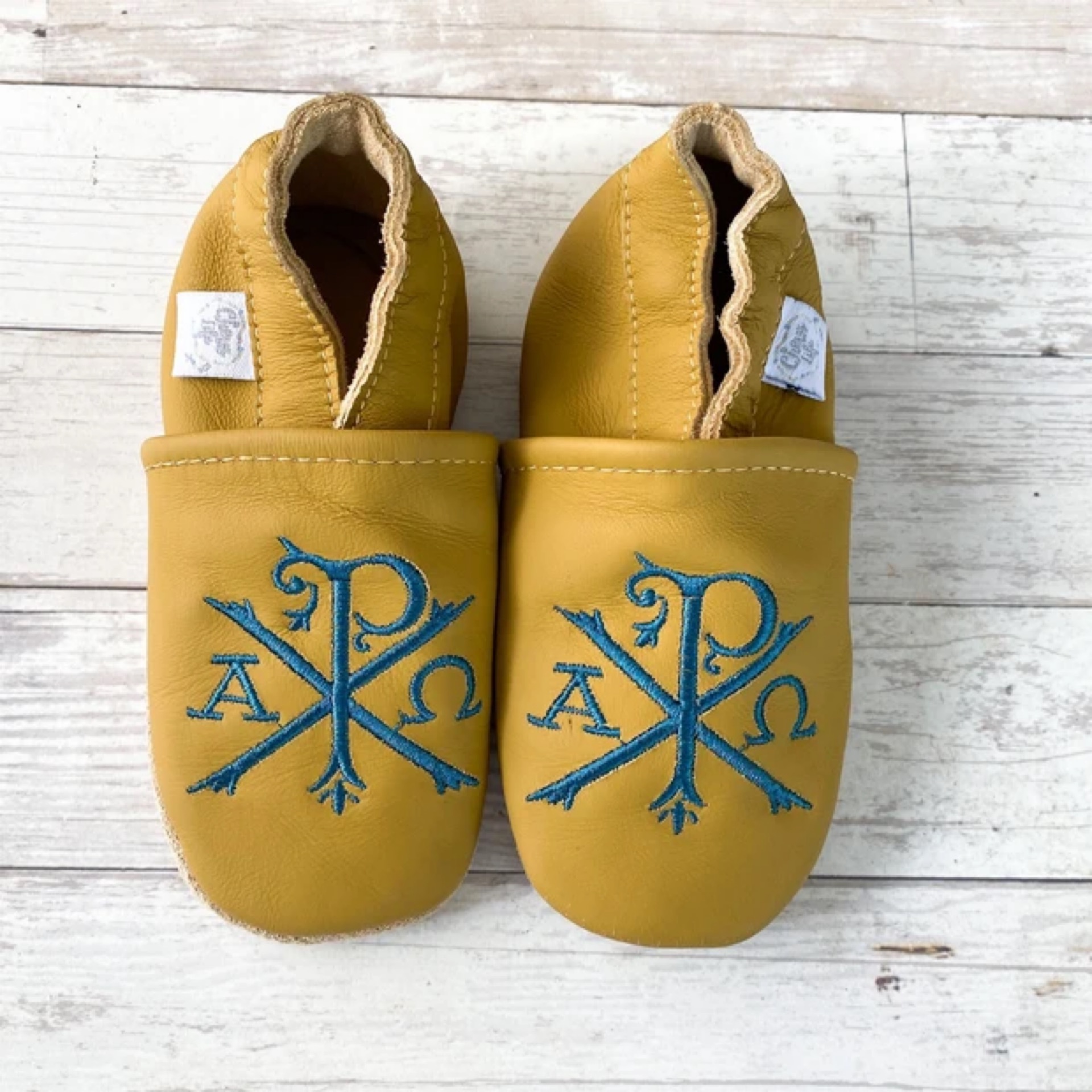 Our yellow crib shoes feature a Chi Rho which is an ancient Christian symbol for Christ. On either side of the Chi Rho symbol are the first and last letters of the Greek alphabet: alpha and omega. Christ said that He is the Alpha and the Omega, the beginning and the end. We hope that your child will become familiar with these symbols so whenever they see them they are reminded that Christ is always present with them.
