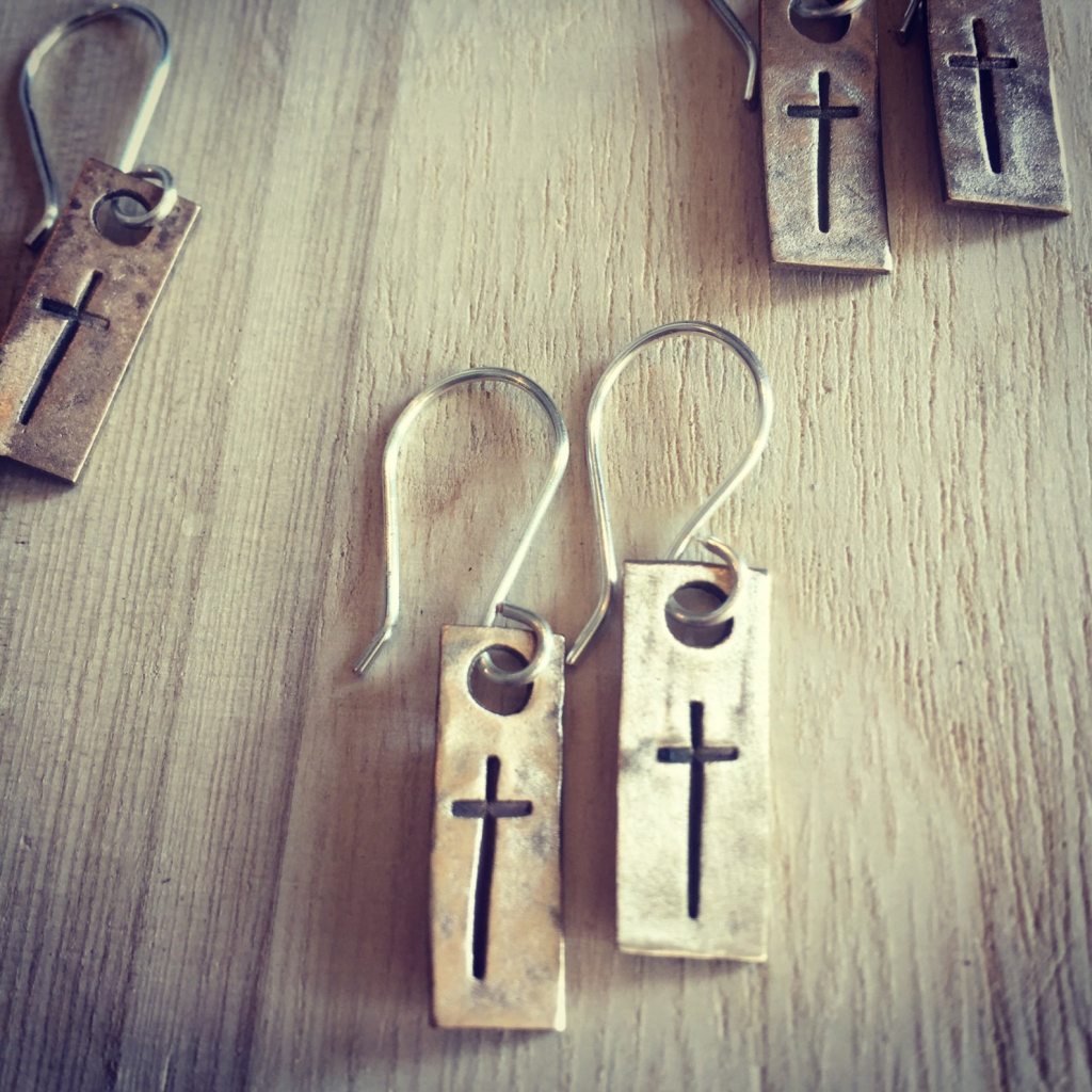Handcrafted bronze Charm with hand drawn Cross. Earrings measure approximately 1 1/2 ". Cross hangs from a handcrafted nickel free silver plated brass ear wire.
