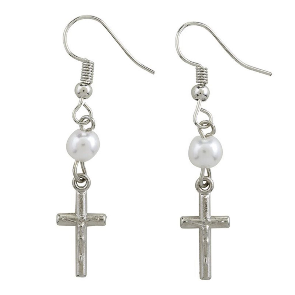 These Crucifix and Pearl Earrings includes silver plated fishhook earwire backrings for securing the jewelry in your pierced ears. The dangling design features a white imitation pearl and silver traditional style crucifix. These wonderfully elegant earrings will make for a great gift item all-year-round.
