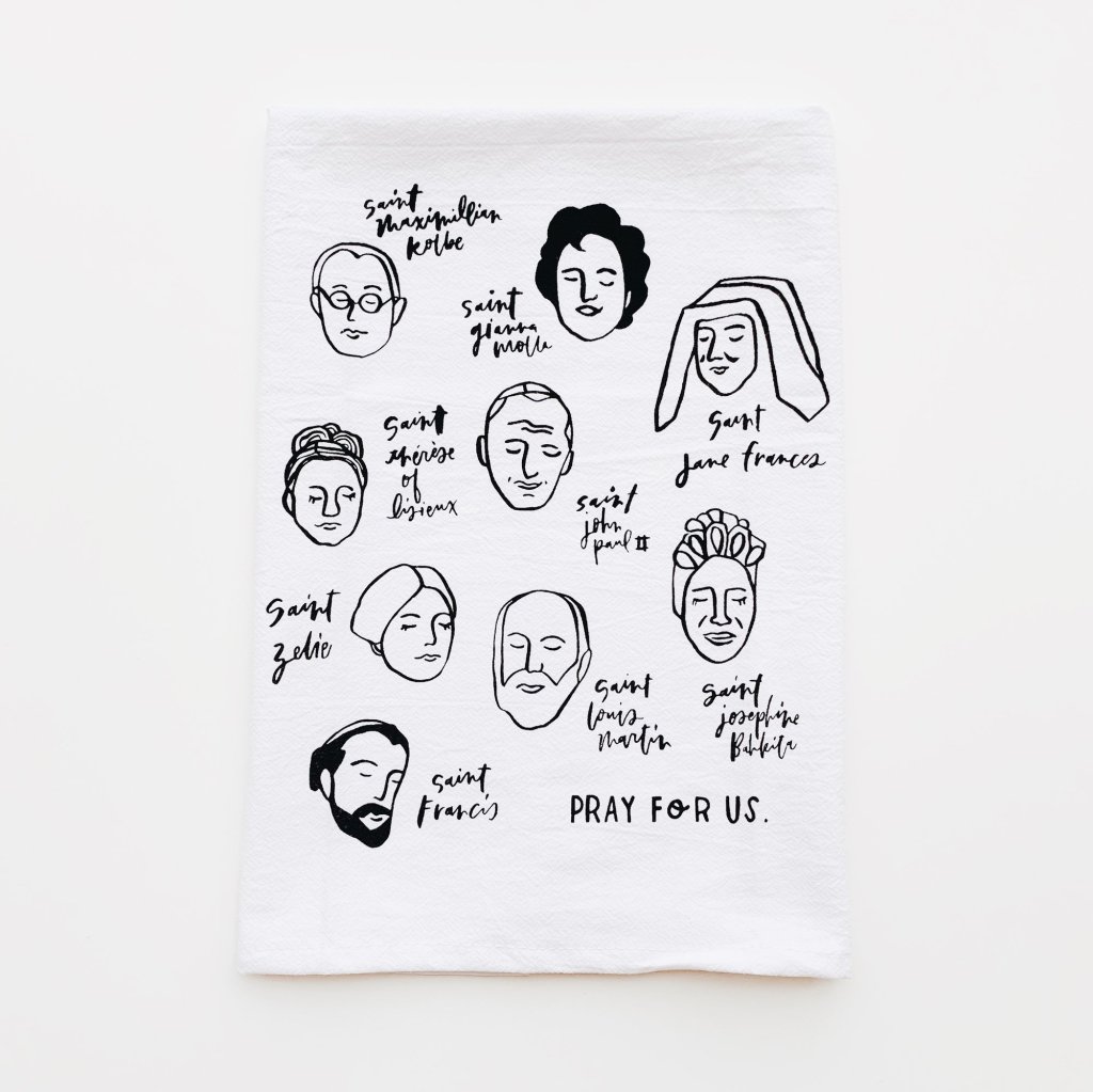 The Holy Friends Tea Towel has a beautiful design that Erica drew with sumi ink of her favorite Saint friends.