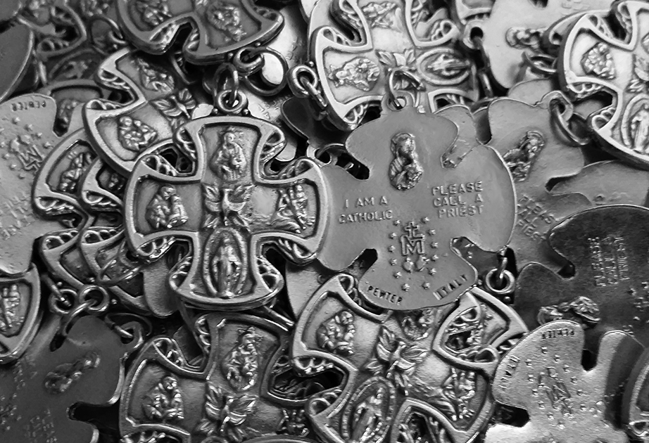 The back of the cross contains images of Our Lady of Mt. Carmel and the back of the Miraculous Medal.