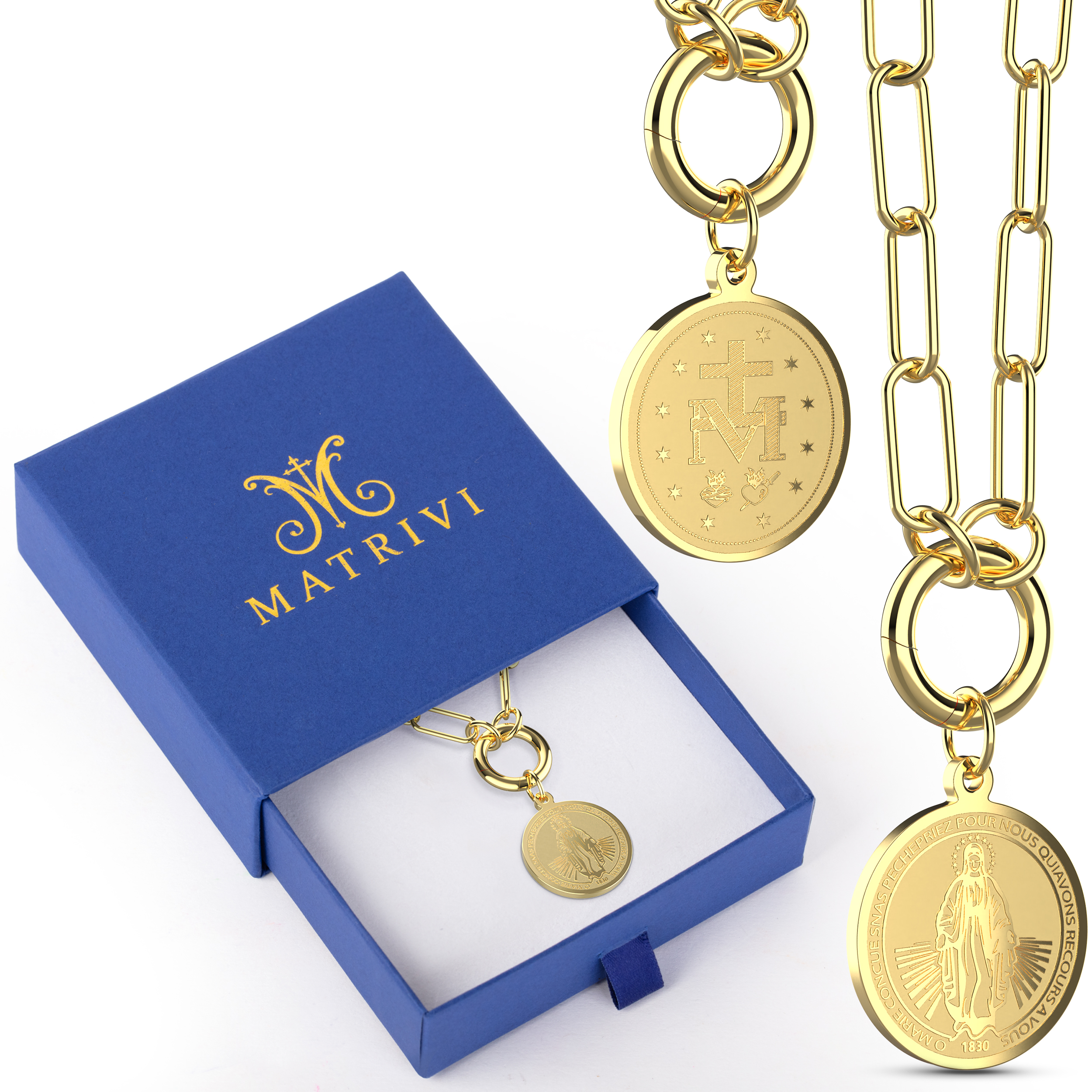 Matrivi Gold Stainless Steel Round Miraculous Medal Paperclip Chain