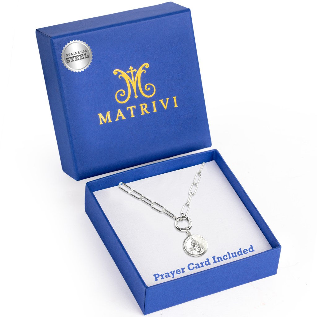 Matrivi Silver Stainless Steel Round Miraculous Medal Paperclip Chain