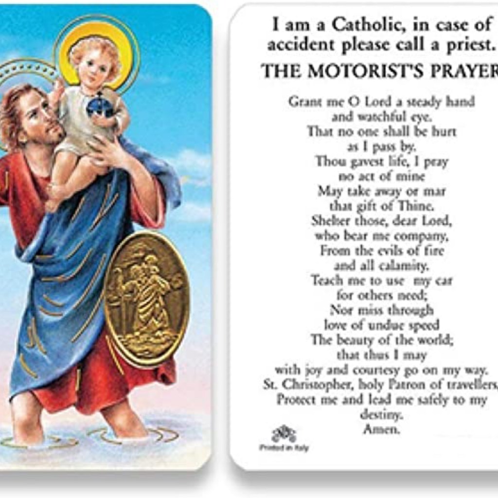 Saint Christopher Motorist Prayer Laminated Prayer Card with Medal Blessed By Pope Francis – medal sealed within the card – motorist's prayer is in the back