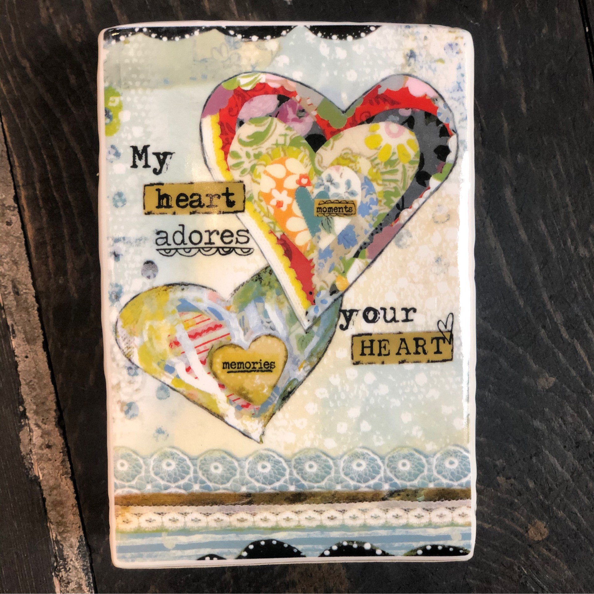 Touch their heart and nurture their strengths with inspirational gifts by artist Kelly Rae Roberts. Her My Heart Plaque features two colorful hearts hovering among the words, "My heart adores your heart." Beautiful and whimsical this artful, stoneware plaque will match any woman's taste. The colors are varied but subdued to match any color scheme and decorating style. It can stand on a desk, table, shelf, counter or dresser top. This is the perfect inspirational quote plaque when you want to remind someone you love who they are, whether they're starting out in the world, going through a hard time or taking on a new challenge. This plaque is especially great for anyone who loves unique, artisan gifts. You can give it for milestones, anniversaries, holidays, birthdays, or just because.