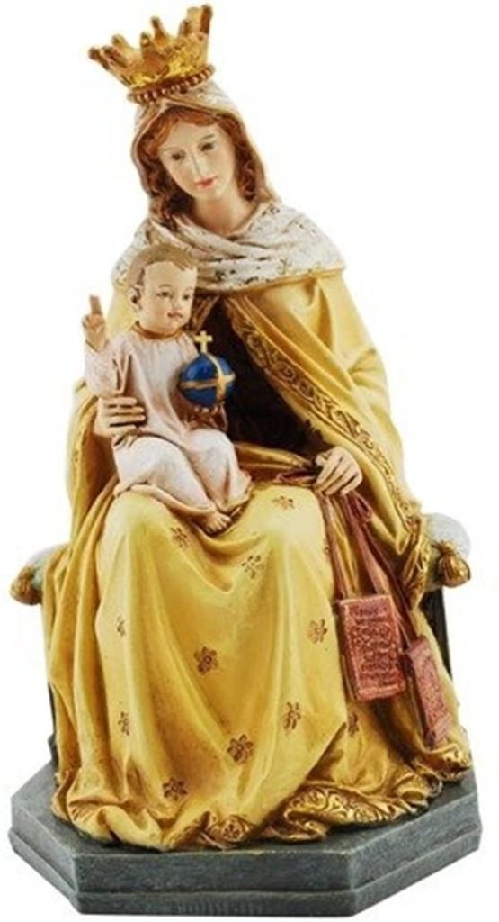 This beautiful Our Lady of Mt. Carmel statue comes from the Joseph's Studio Collection. Measures 8". Crafted from resin and stone. Our Lady of Mount Carmel is the title given to the Blessed Virgin Mary in her role as patroness of the Carmelite Order. The first Carmelites were Christian hermits living on Mt. Carmel in the Holy Land during the late 12th to early 13th centuries. Since the 15th century, popular devotion to Our Lady of Mt. Carmel has centered on the Scapular of Our Lady of Mount Carmel, a sacramental associated with promises of Mary's special aid for the salvation of the decorated wearer.