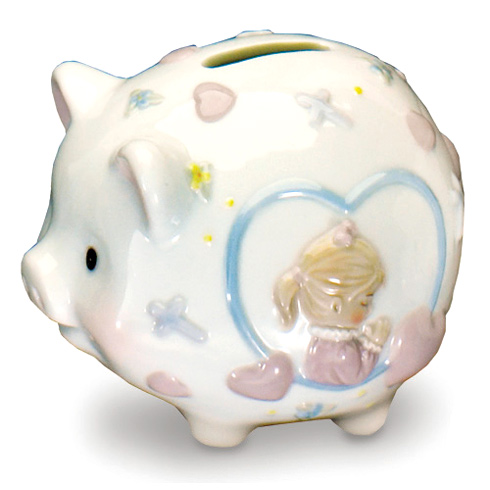 Piggy Bank Girl N1692G tlvignaroli 5 years ago This ceramic 5 inch piggy bank has a praying girl in the center of a pink heart.