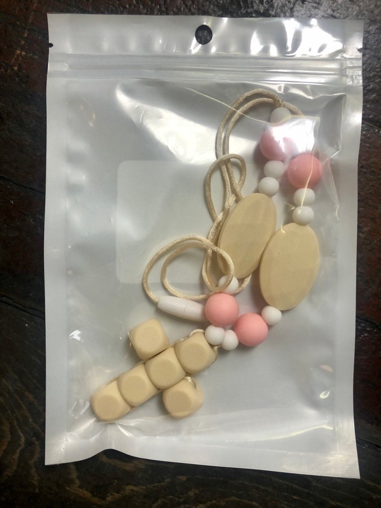 Pink & Cream Little Saints Chewelry Mom Necklace. Mom's can wear these necklaces as a help for their little ones to chew while they are cutting teeth. A great gift for a new momma.