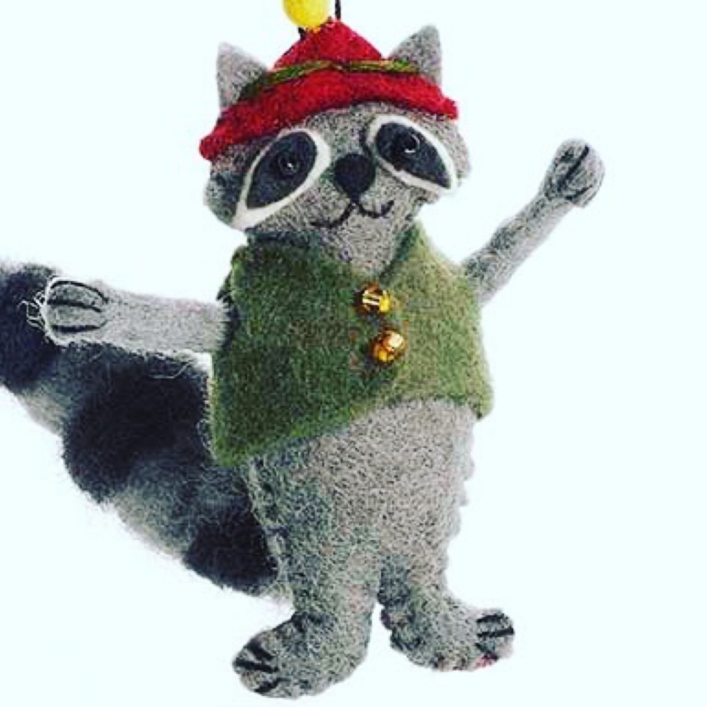 Needle-felted wool raccoon ornament feels right at home on your holiday tree. Comes dressed for winter weather in a felted wool vest. Adorable! 4"h