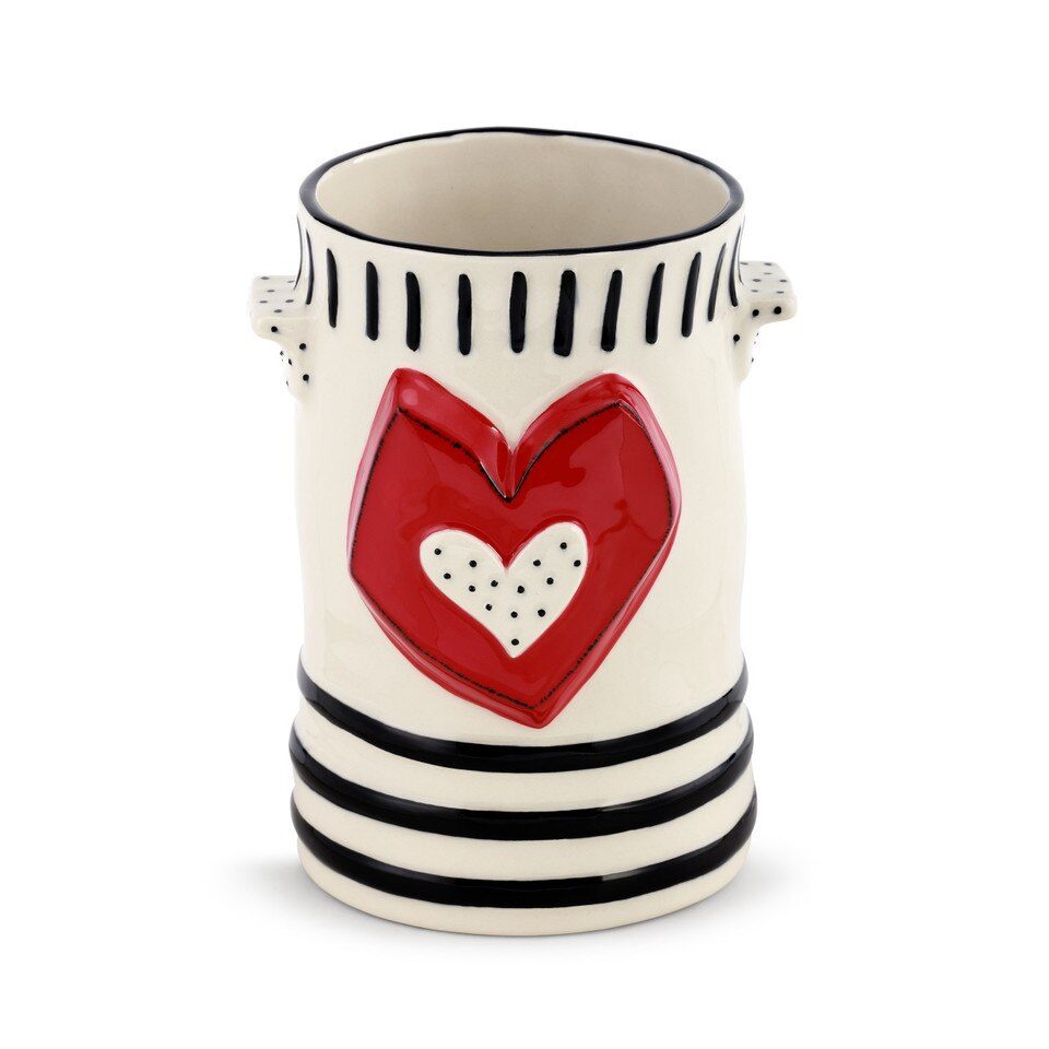 The Red Heart Crock is a beautiful large ceramic crock with an artisanal feel and handcrafted detailing throughout. This unique ceramic crock is adorned with a slightly raised pattern with a molded heart and texture paired with a fun pop of color against a bold black and white design. Versatile and stylish, this crock can hold up to 50 oz. of any liquid or can be used as a playful decoration to hold utensils or flowers throughout the home. A part of The Heartful Home by Tracy Pesche Collection, this piece celebrates the love and beauty that is experienced between friends, family and other loved ones each and every day throughout our lives. This beautiful crock will make for a wonderful gift for mom, grandma, an aunt or a sister.
