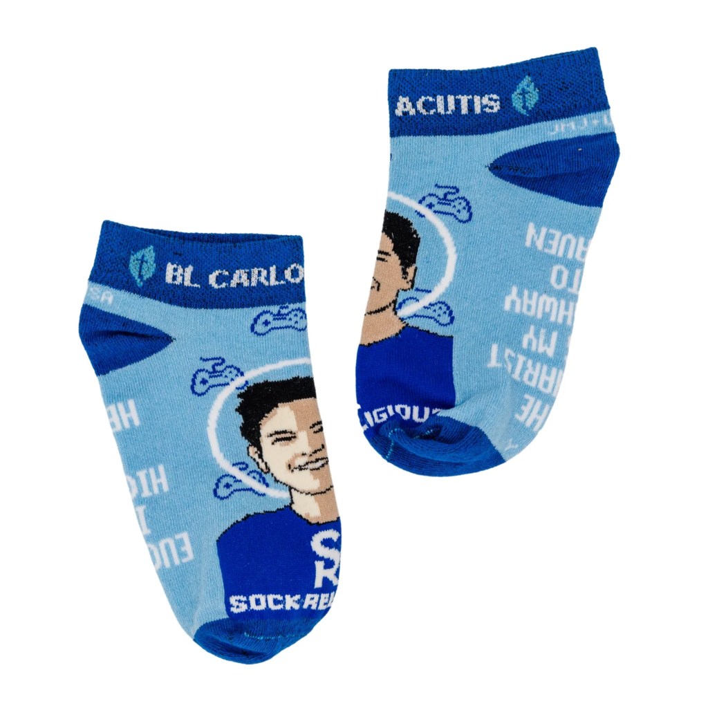 Catholic Sprouts Blessed Carlo Socks feature Carlo and his big smile, along with video game controllers. On the bottom of the foot, the sock features a quote from Carlo, "The Eucharist is my highway to heaven."