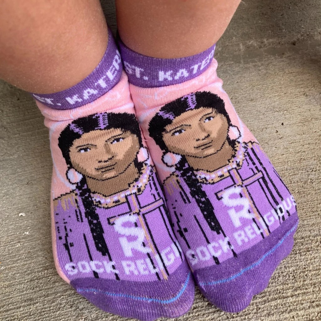 Saint Kateri socks are "no show" socks and come in one size that will fit most children. Produced by our good friends over at Sock Religious, each sock was made right here in the USA. The ultra soft thread is durable, stretchy and washable.