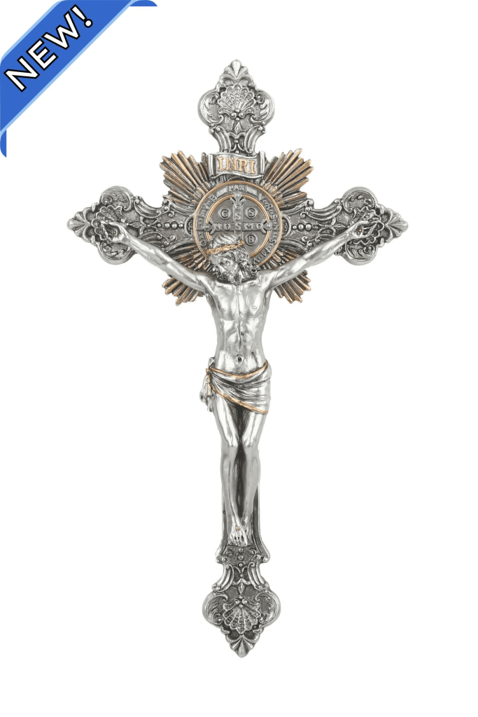 St. Benedict Crucifix in pewter style finish with gold trim SR-76590-PE Goldscheider Olive and Myrrh 1 month ago Back side of St. Benedict medal shows on the back of the crucifix 14" Veronese Collection