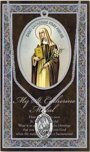 Saint Catherine 1.125" Genuine Pewter Saint Medal with Stainless Steel Chain. Silver Embossed Pamphlet with Patron Saint Information and Prayer Included.