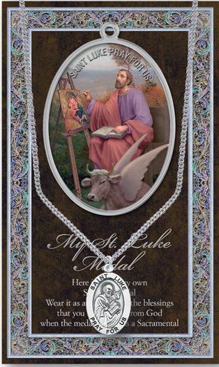 Saint Luke 1.125" Genuine Pewter Saint Medal with Stainless Steel Chain. Silver Embossed Pamphlet with Patron Saint Information and Prayer Included.