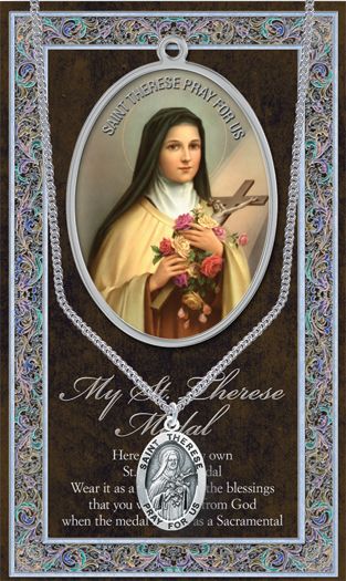Saint Therese 1.125" Genuine Pewter Saint Medal with Stainless Steel Chain. Silver Embossed Pamphlet with Patron Saint Information and Prayer Included.