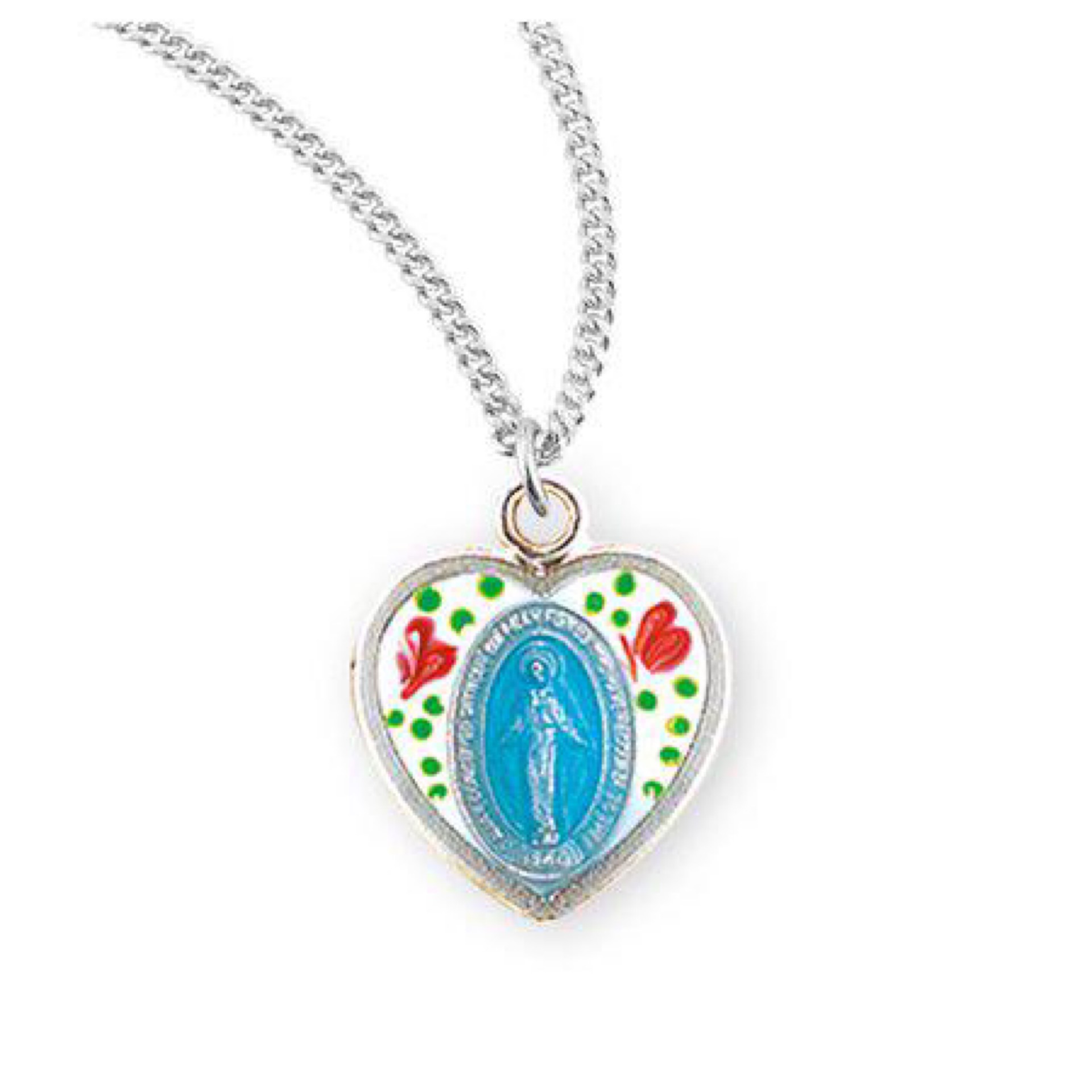 Sterling Silver Flower Enameled Heart Shaped Miraculous Medal | 0.6 0.4 x 11mm) | Velvet Gift Box | 13 b Chain S3160E13
